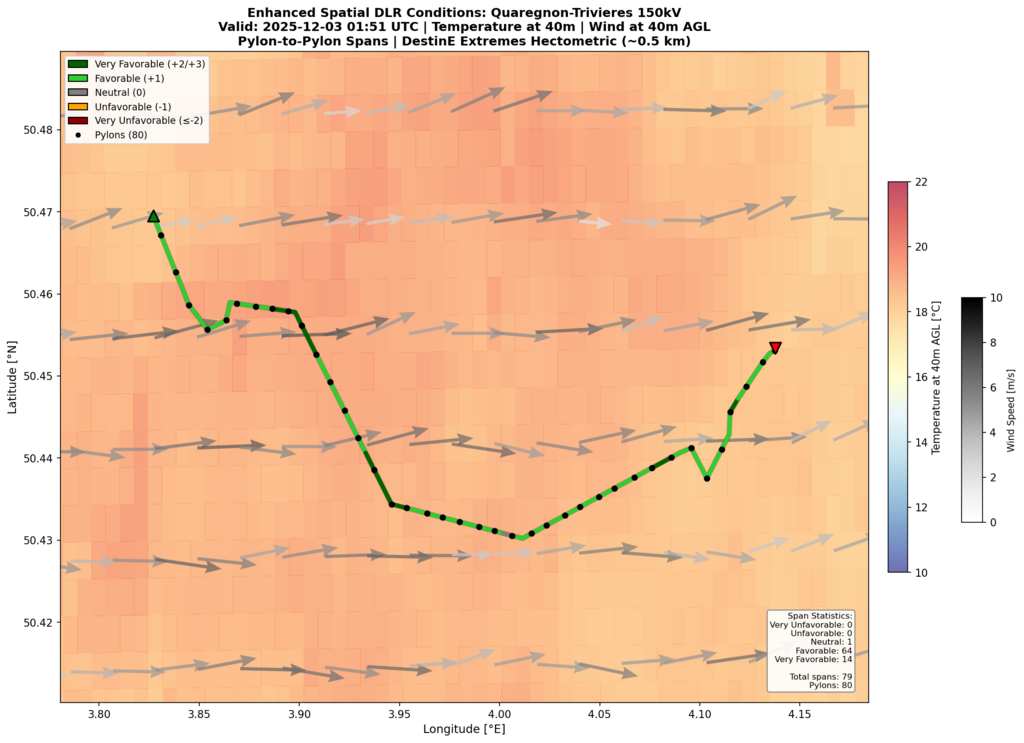 For Elia’s Quaregnon–Trivières 150 kV line, high resolution DestinE data revealed predominantly favorable conditions:
