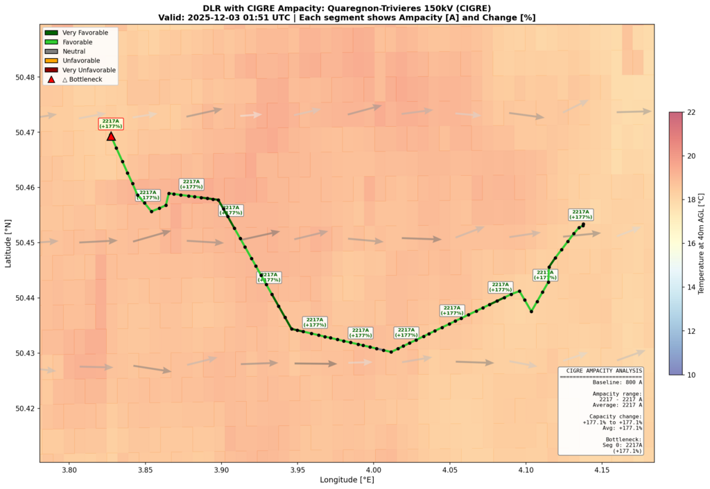 Despite favorable conditions elsewhere reaching 2300+ A, the entire corridor capacity is constrained by this single segment—demonstrating the operational principle that a transmission line’s effective rating equals its weakest link. This spatial granularity enables TSOs to identify specific infrastructure where targeted measurements or localized weather stations would provide the greatest operational benefit.