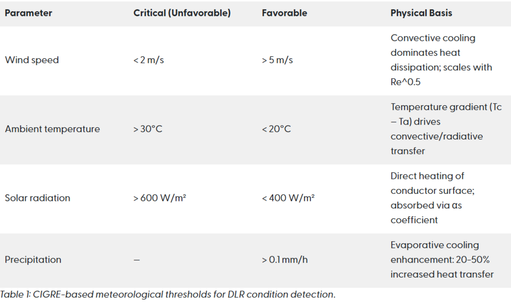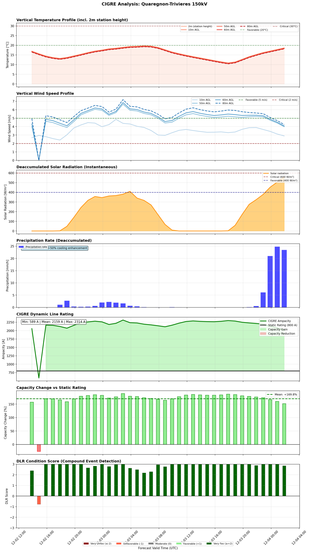 The pilot service uses a compound event detection methodology that evaluates the combined impact of key meteorological variables, including wind, temperature, solar radiation and precipitation, rather than single-parameter thresholds. This reflects the physical heat balance of overhead conductors, where multiple processes interact. For example, high temperatures can be offset by wind or rainfall, while low wind speeds combined with high solar radiation may create unfavourable operating conditions due to reduced cooling and increased heating.